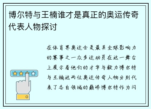 在体育界,奥运会是最具全球影响力的赛事之一,众多运动员在这一舞台上展示着他们的才华与毅力。博尔特与王楠,这两位奥运传奇人物,分别代表了各自领域的巅峰。博尔特作为“闪电”飞人,以其极具震撼力的速度在百米、二百米赛场上创造了无数纪录。而王楠则是中国乒乓球的代言人之一,凭借卓越的技术与坚定的意志,屡次在奥运赛场上取得优异成绩。本文将从四个方面对博尔特与王楠谁才是真正的奥运传奇代表人物进行探讨,具体包括:他们的奥运表现、所代表的体育项目的影响力、他们的传奇成就与历史地位、以及他们对于后人运动员的影响力和启示。通过这四个方面的深入分析,我们将对这两位传奇人物做出客观而全面的比较。